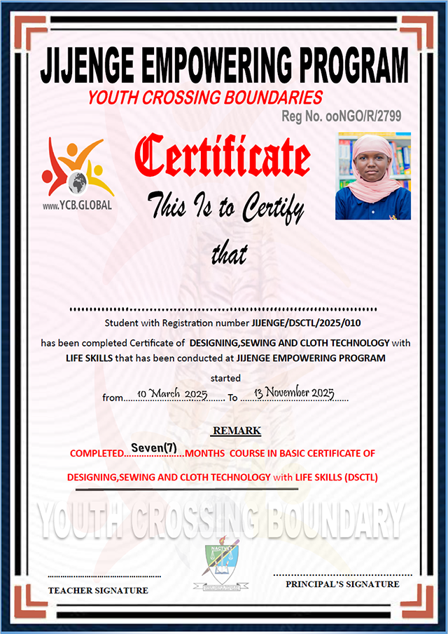 Wir bieten neun Monate lang Kurse in den Bereichen Computerschulung, Schneiderei, Englisch, »life skills« und Unternehmertum (um eigene kleine Shops gründen zu können) an. Im November 2025 fand die erste Zeugnisausgabe statt.